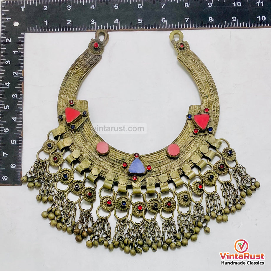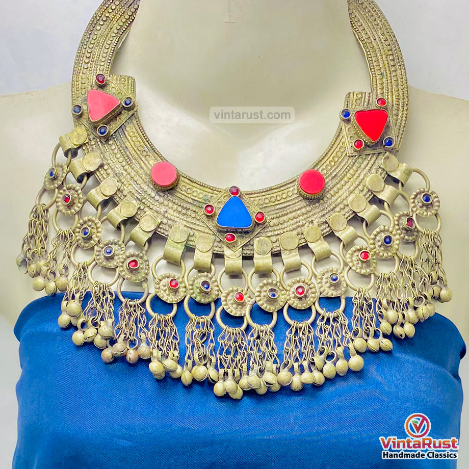 This Vintage Boho Tribal Statement Choker Necklace features an authentic handmade design enriched with traditional cultural details. The centerpiece is adorned with vibrant blue and red stones, adding a bold pop of color and enhancing the necklace's vintage charm. Its striking arrangement gives the piece a distinctive tribal look that stands out effortlessly.