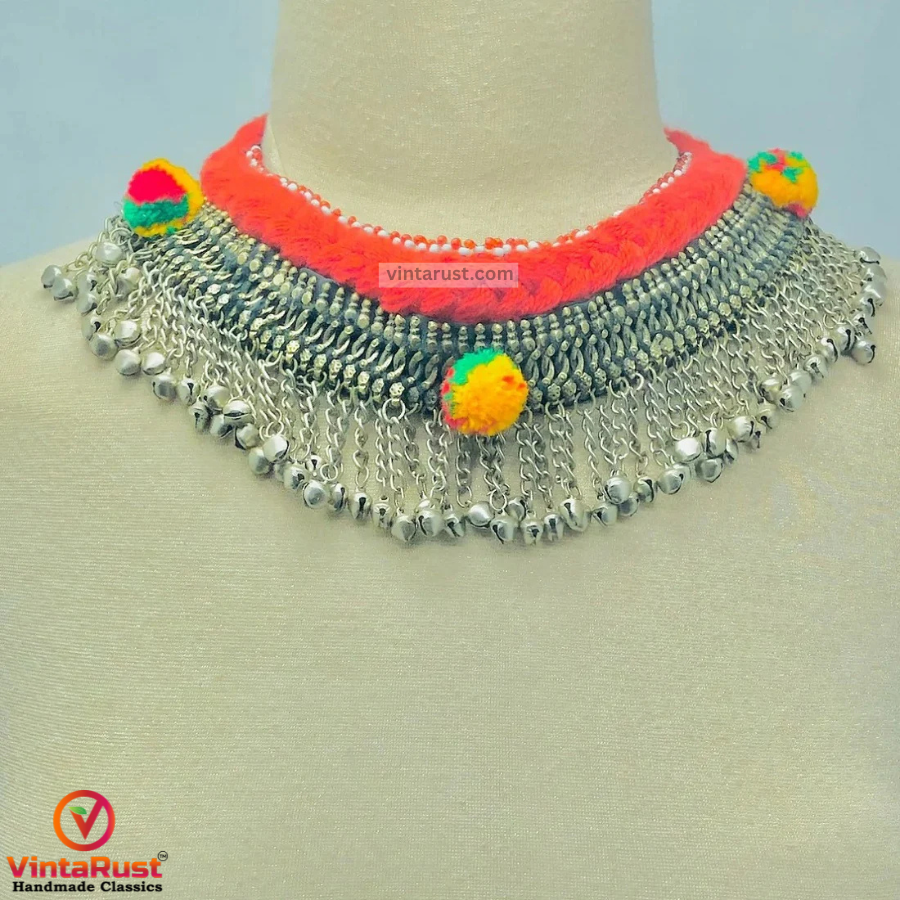 This incredible Afghani statement handmade choker is one of the funky pieces from our collection. The colorful tassels are the highlight of this choker. This beautiful piece of tribal jewelry is perfect for a unique look. Silver dangling bells are attached to the braided cord of this choker.