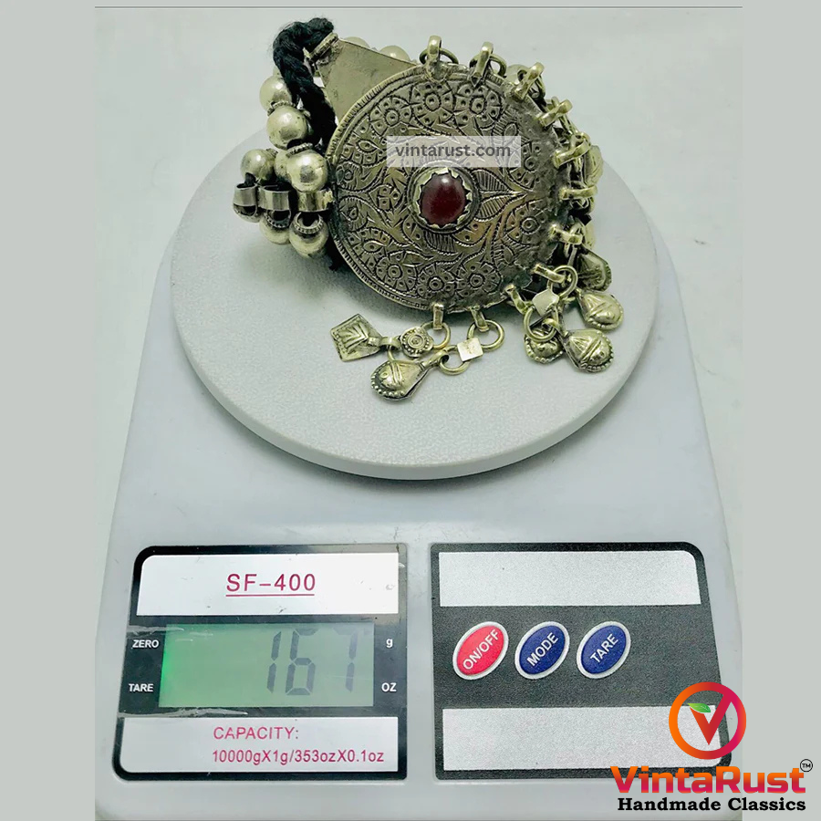 This metallic bead choker necklace was handcrafted in early 1990s by the talented craftsmen of South Asia. At the center of the necklace there is an elegant pendant with hand engraved tribal design. A delicate glass stone is inlaid on the pendant of this tribal piece. This exquisite tribal peace makes pleasing noise whenever you wear it. German silver of nice quality is used while crafting this tribal necklace.