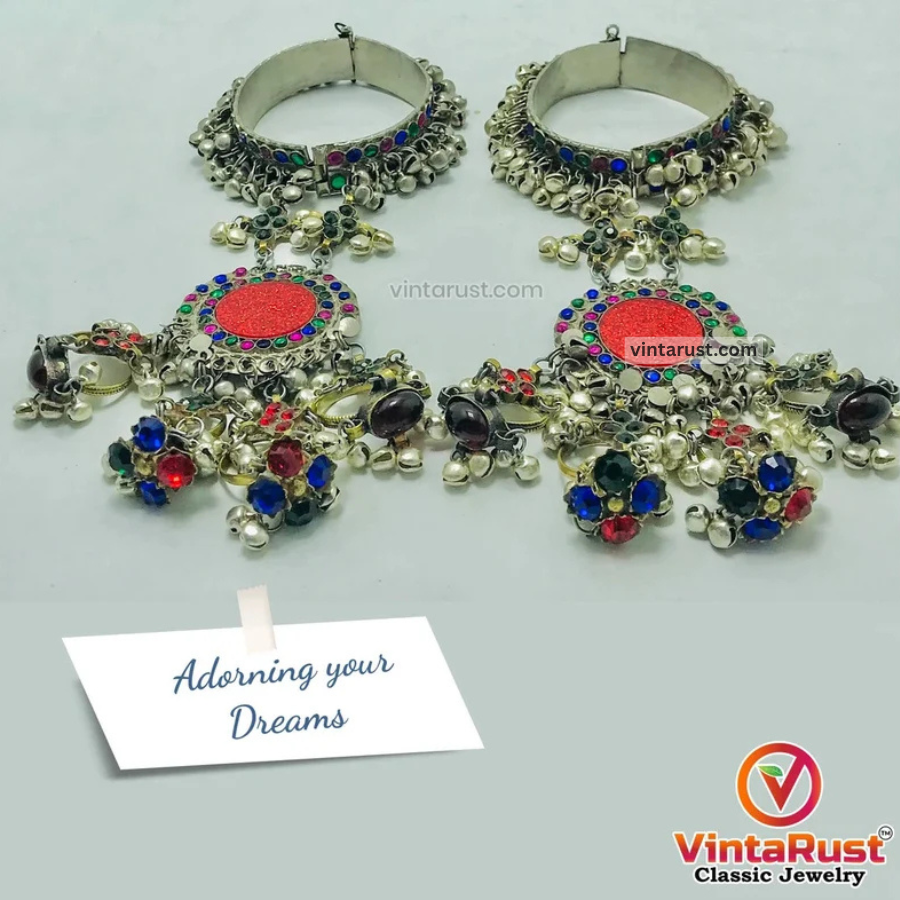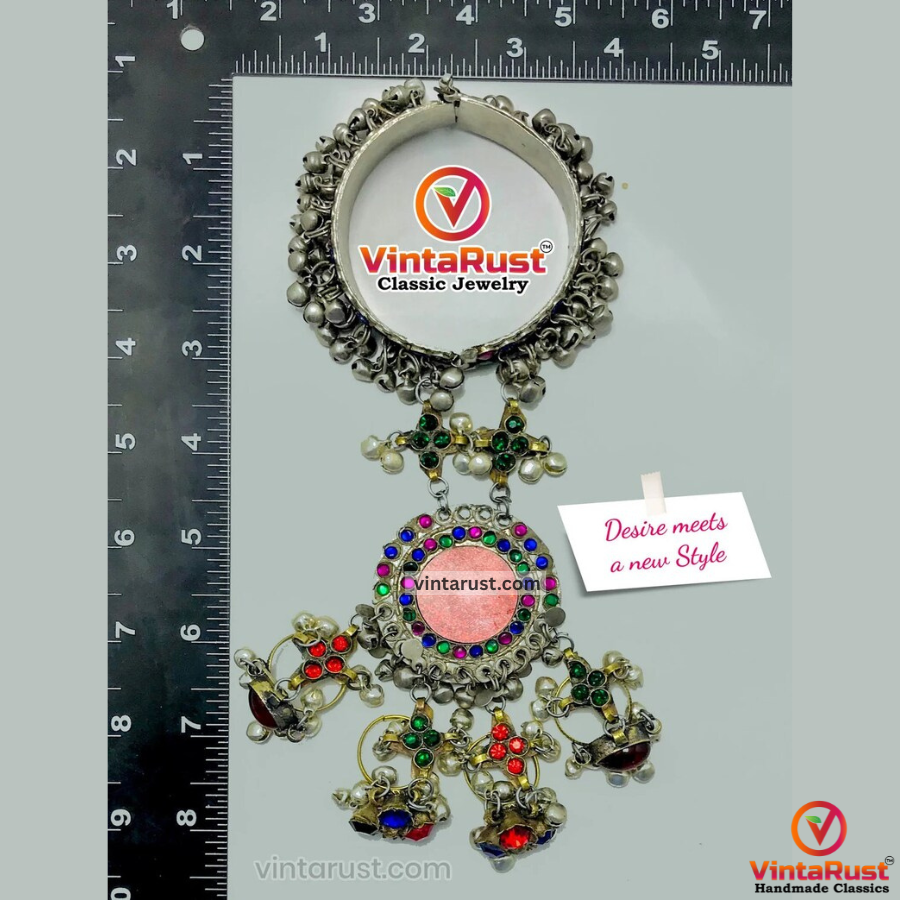 This exquisite vintage Afghan slave bracelet is crafted from antique metal, adorned with vibrant red and multicolor glass stones. The bracelet showcases intricate filigree designs alongside its embellishments. This alluring tribal bracelet consists of five rings attached with it.