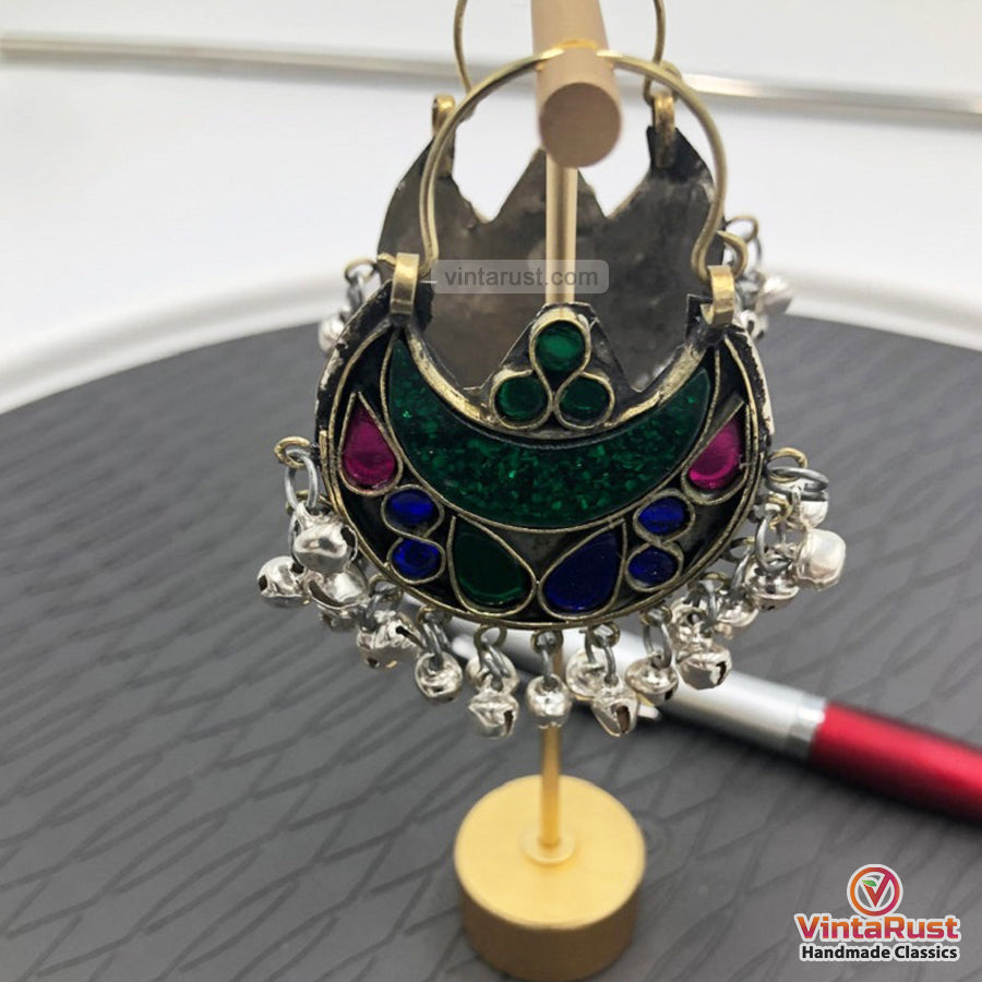These chandbali pairs of earrings are epitome of tradition, embellished glass stones and dangling bells at the bottom. The glass stones embedded in archaic motifs are complemented by the silver tones of the earrings, flaunting all the tribal vibes. You can wear this elegant piece with any traditional or trendy attire, and it would get along your chosen style to give you an effortless look. They make for a great gift for someone who appreciates unique and culturally significant jewelry pieces.