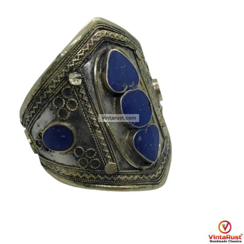 - This beautiful Afghan golden-hued vintage slave bracelet is an antique jewelry piece. This Afghan cuff bracelet is inlaid with semi-precious Lapis Lazuli stones and beautiful hammered design throughout. This single handcuff bracelet has design between the semi-precious stones that are symmetrical and stunningly crafted.