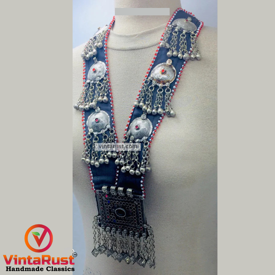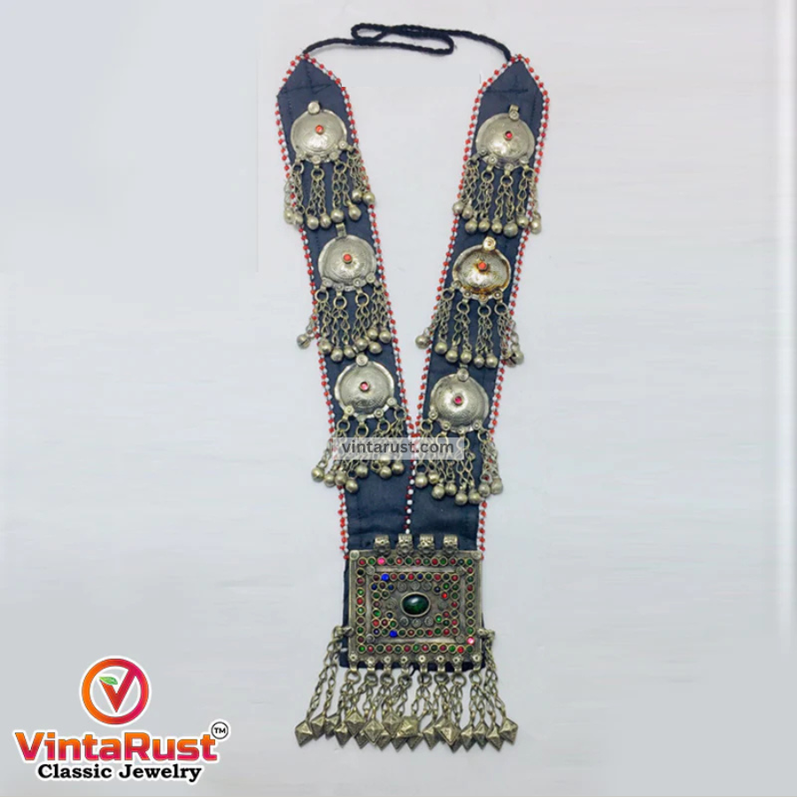 This Turkmen traditionally-rich necklace is a combination of different colors. Glass stones and multiple pendants are beautified on this outstanding necklace. This exquisite piece is handcrafted by Kuchi artisans. With the fabric of this necklace, there are vintage coin pendants with dangling tassels on each side.