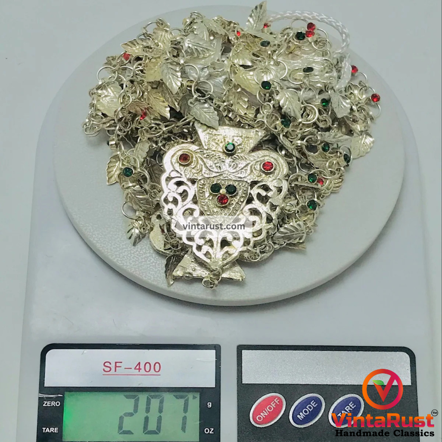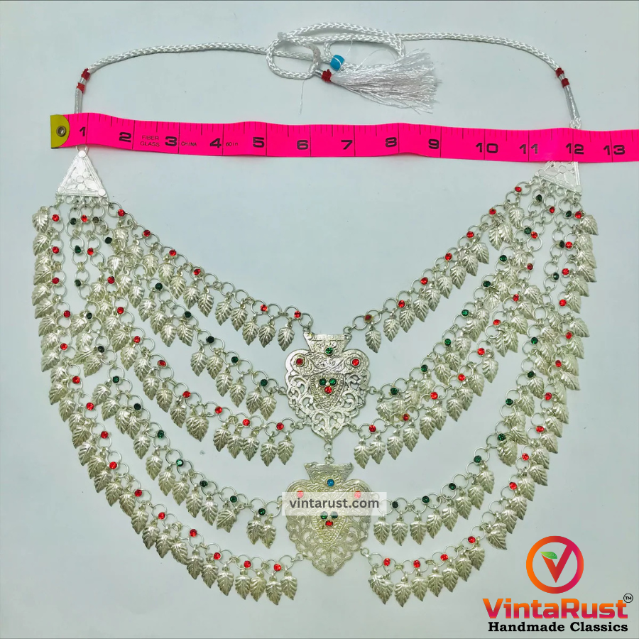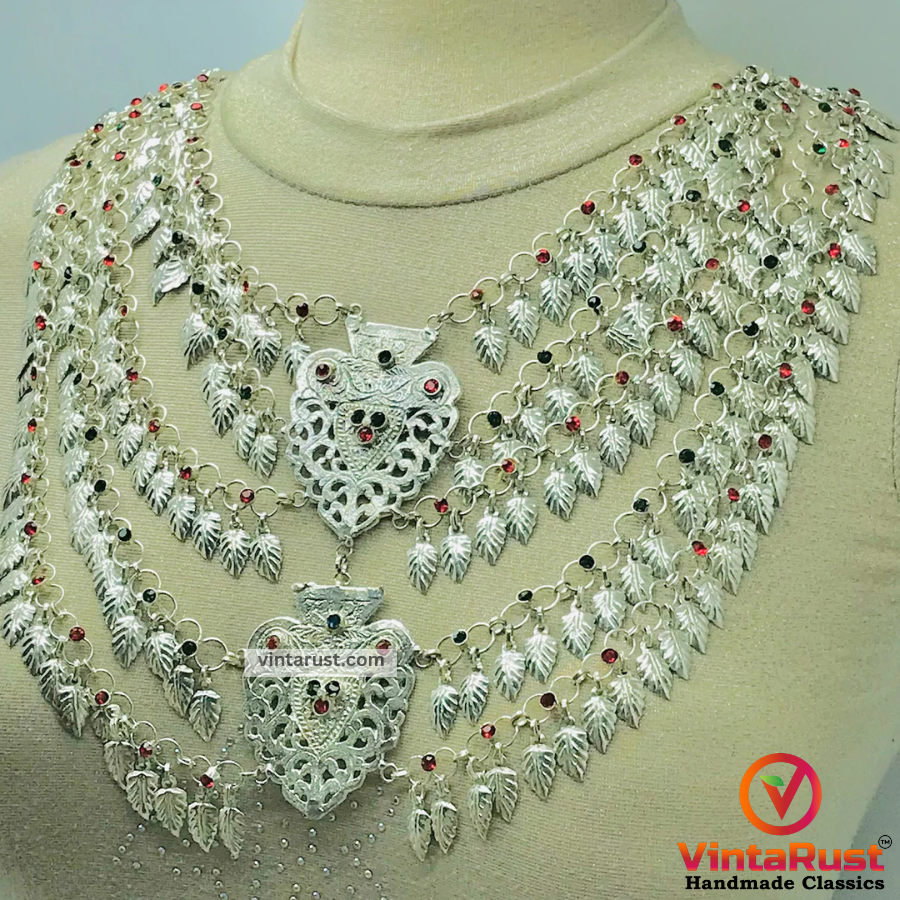 This Afghani tribal Kuchi silver-hued bib necklace is one of the unique yet elegant handcrafted tribal ornaments. This bib-style multilayer tribal Afghani necklace is delicately embellished with tiny charming red glass stones all over it. Silver metallic leaves are hung all over this massive bib tribal necklace.