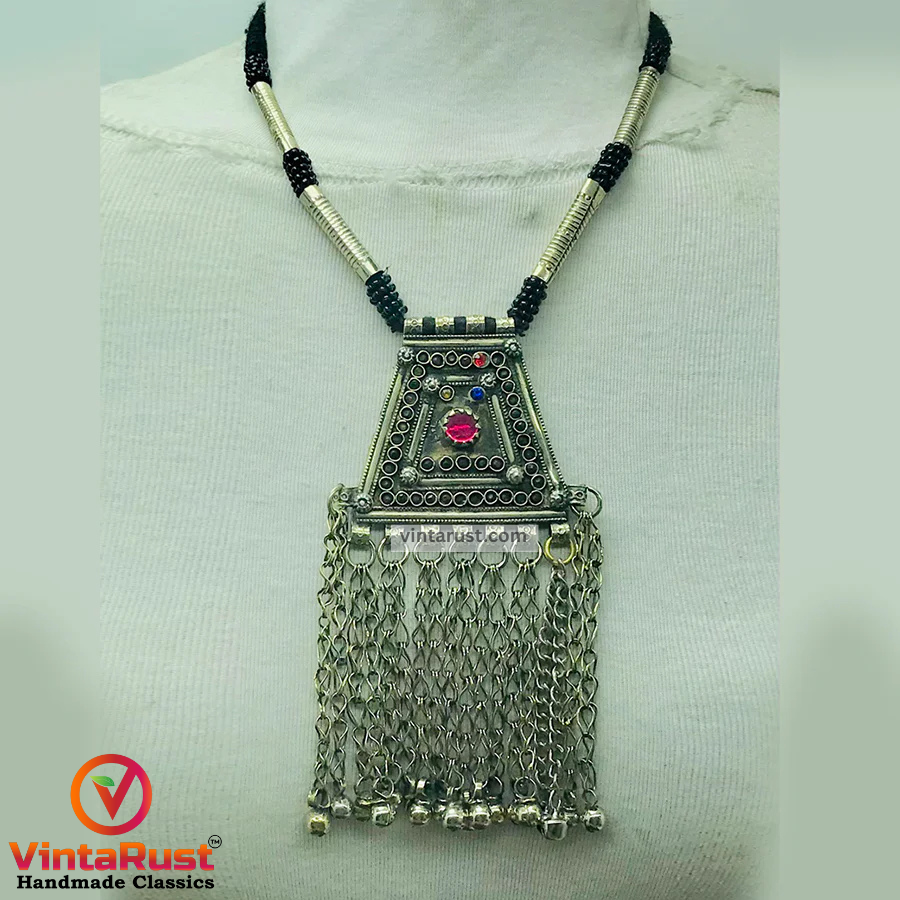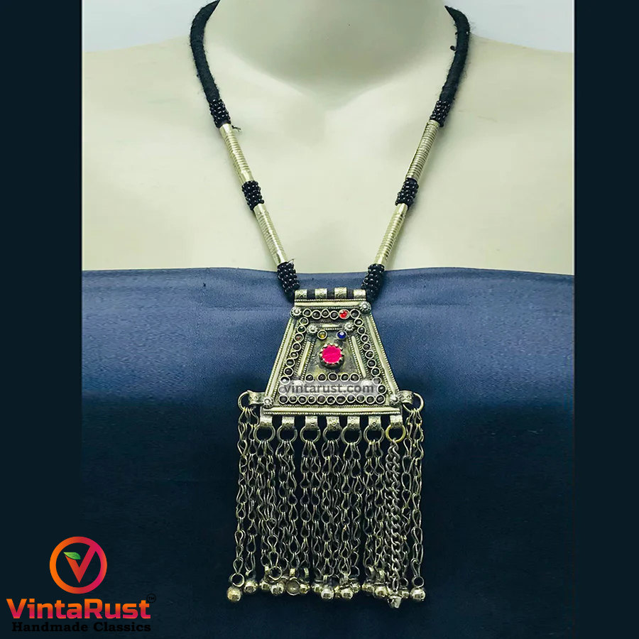 The historical feel this rustic-hued Kuchi pendant necklace gives is incredible. This exquisitely crafted necklace is crafted to perfection. Meticulously crafted dangling tassels are beautified in this necklace. The magnificent pendant in this tribal ethnic necklace is embellished with silver dangling rhythmic bells with chains.