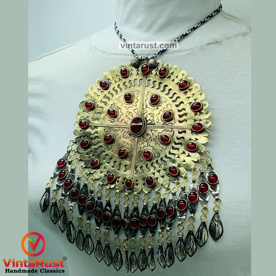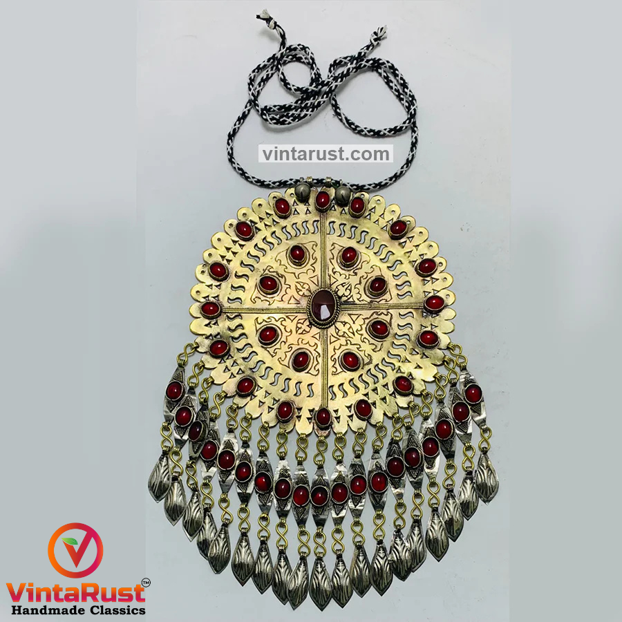 This Turkmen antique design mala necklace handcrafted by the natives of Central Asia is made up of a satisfactory quality metal alloy. This massive vintage tribal necklace is one of the most admired pieces from our jewelry collection. A metallic lock is used to secure this tribal necklace around your neck. This elegant and fascinating tribal necklace is handcrafted by talented craftsmen.