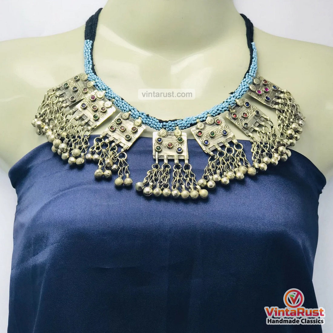 Multihued glass stones are beautified on the amulet-shaped pendants which are giving traditional touch to this tribal ornament. Tiny sky-blue beads are used to increase the elegance of this tribal piece. A fine quality of black thread is used to assemble this tribal choker necklace.