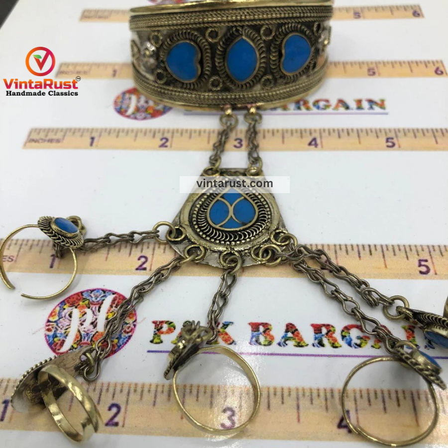 The ethnic turquoise stone embedded handpiece is a stunning example of handmade vintage stone slave bracelet with rings, designed to captivate with its intricate artistry. This silver oxidized jewelry piece boasts a commendable design featuring five rings attached to a bracelet, creating a statement slave bracelet with rings that embodies timeless elegance.